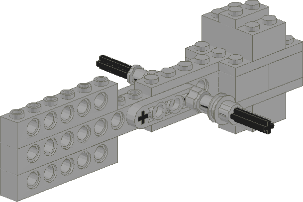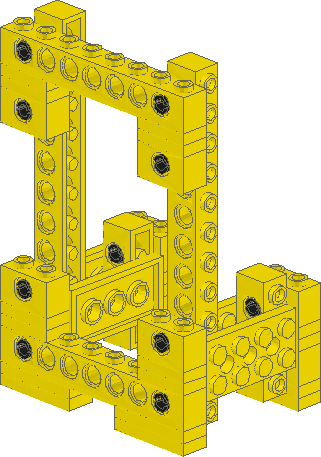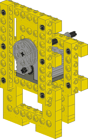 Ping-Pong Ball ShooterI've been powering this off my train regulator because I'm all out of batteries. I've been shooting the balls over 20 feet with the motor turned up to full speed. The hammer I think may need some redesigning, it tends to break apart after a few shots. It's spinning pretty fast, so it hits the balls pretty hard. For now I've wrapped rubberbands around the bricks on each end, and it seems to be holding together. Construction notes: There's supposed to be a large tire, like the large spoked one found in the mindstorms sets behind the motor, but I couldn't find that part. The large wheel acts as a flywheel, to keep the motor spinning when the hammer impacts the ping-pong ball. The motor should be connected to the large pulley on the flywheel axle with a small white belt, and the hammer should be connected with a blue belt. The blue belt allows enough slip that when the hammer is completely stalled, the motor continues to spin, but is still tight enough that the hammer comes up to speed fairly quickly. I'm still not sure if the flywheel is needed. It's difficult to tell if the motor is stalling or not, at least without hooking up some kind of RPM measuring device. Click on the images to get the LDraw .dat files. |
